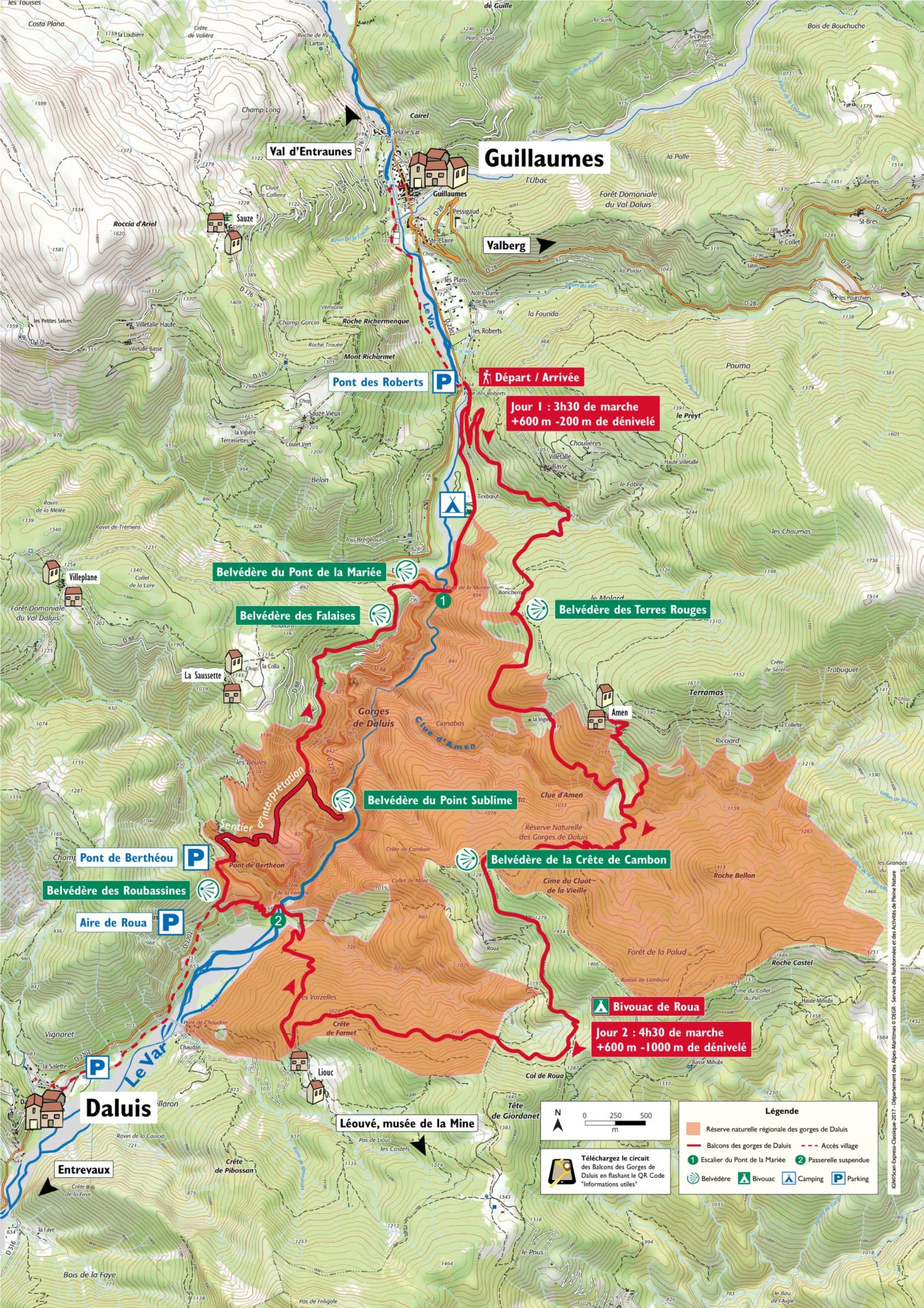 Une grande partie de la randonnée se déroule dans la Réserve naturelle régionale des gorges de Daluis, co-gérée par la Communauté de Communes Alpes d’Azur et la Ligue pour la Protection des Oiseaux Provence-Alpes-Côte d’Azur. Ce classement a pour but la préservation du patrimoine géologique et minéralogique et le maintien de la biodiversité. Le circuit sur lequel vous allez cheminer a été réalisé et est entretenu par le Département des Alpes-Maritimes et la Communauté de Communes Alpes d’Azur. Il chemine sur les communes de Guillaumes et de Daluis avec une aire de bivouac aménagée et située sur la commune de la Croix-sur-Roudoule.